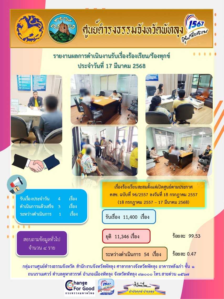 สถิติรับเรื่องร้องเรียน/ร้องทุกข์ วันที่ 17 มีนาคม 2568