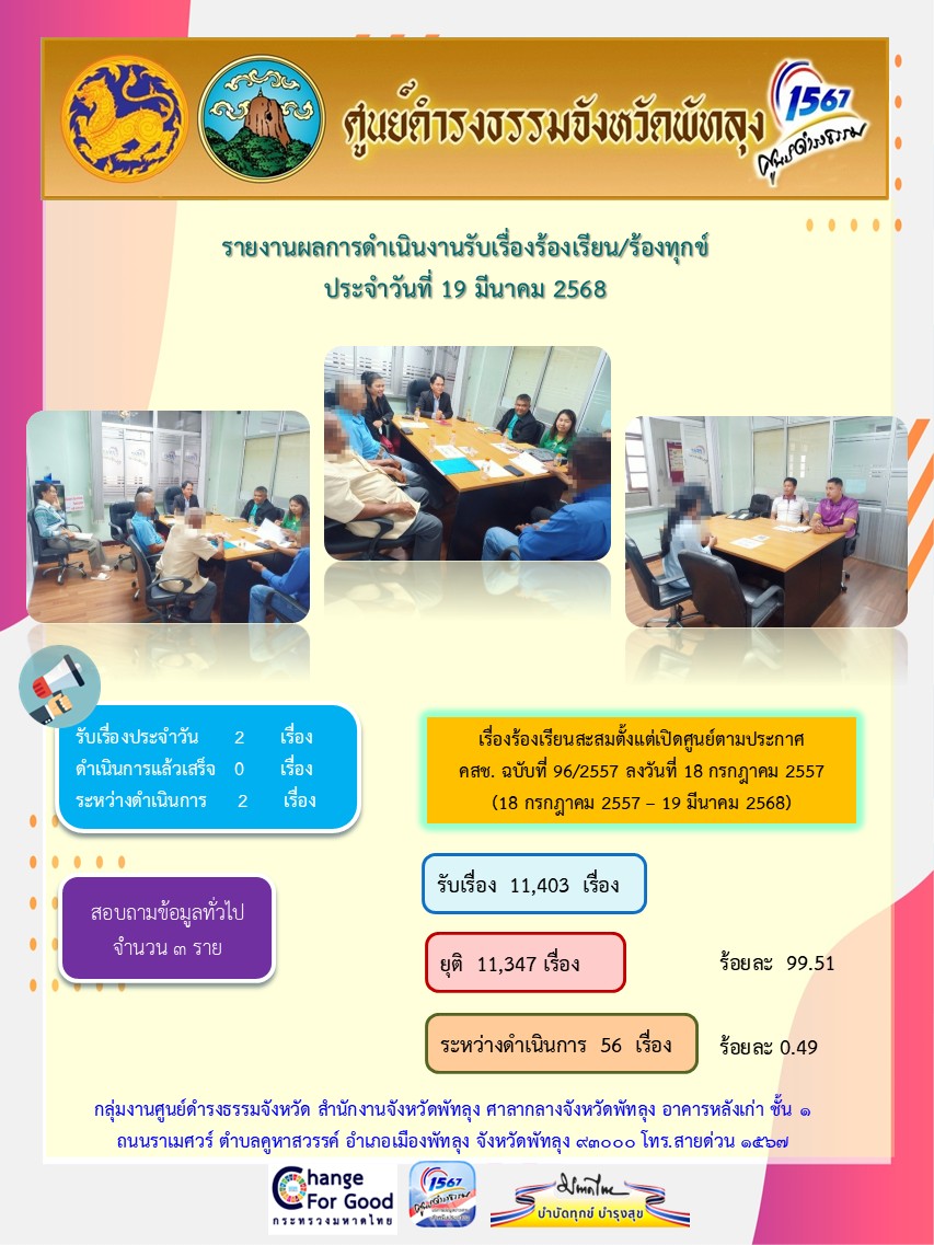 สถิติรับเรื่องร้องเรียน/ร้องทุกข์ วันที่ 19 มีนาคม 2568