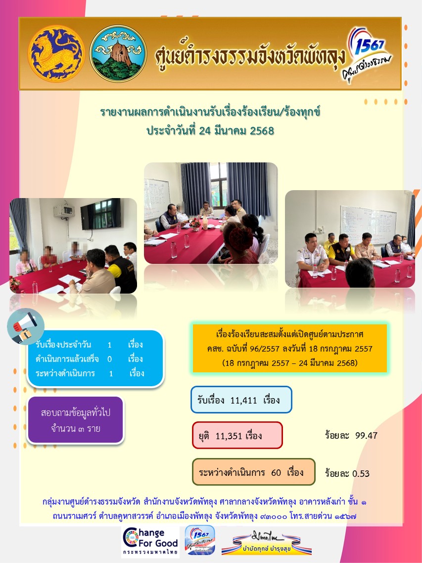 สถิติรับเรื่องร้องเรียน/ร้องทุกข์ วันที่ 24 มีนาคม 2568