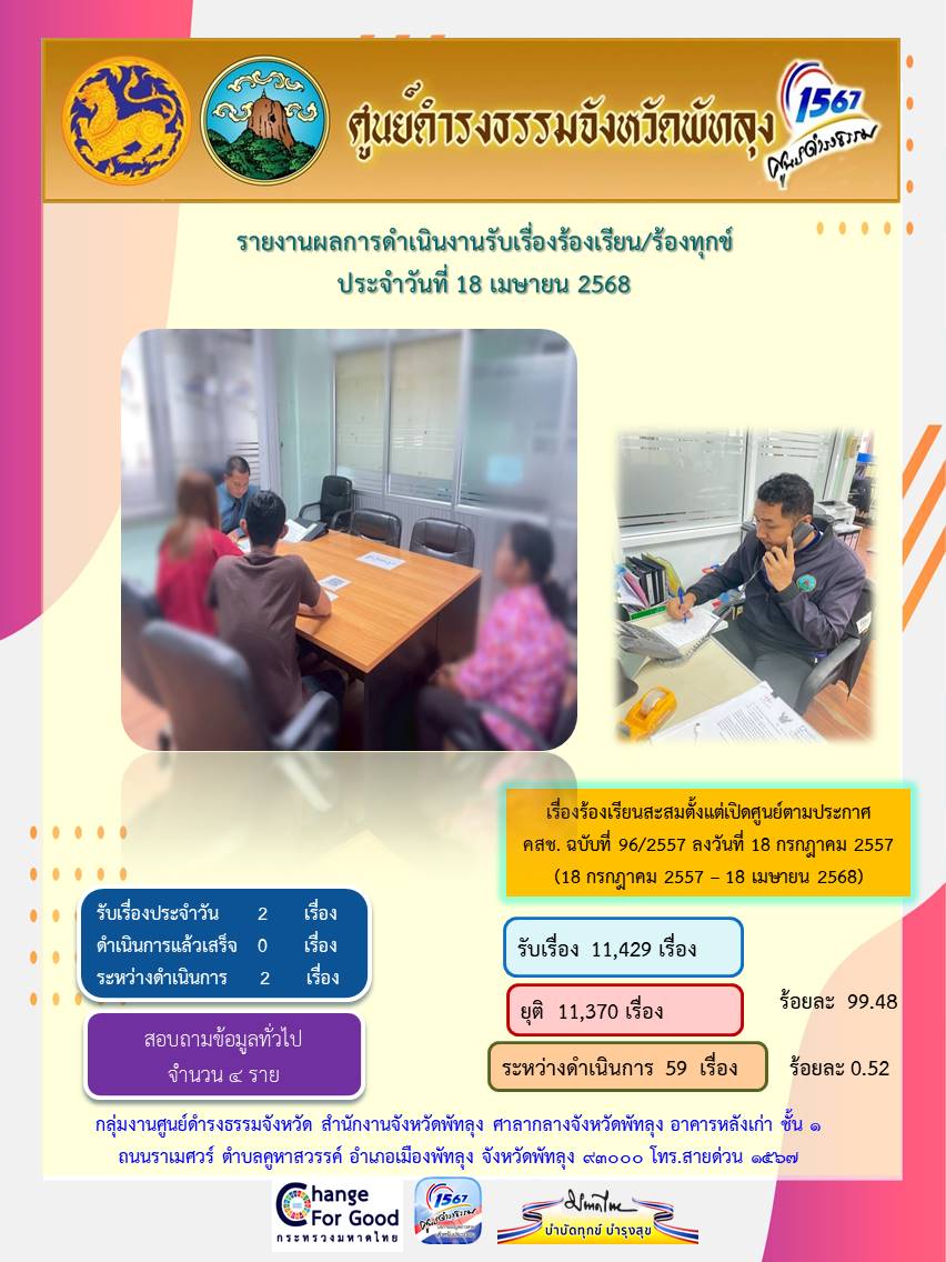 สถิติรับเรื่องร้องเรียน/ร้องทุกข์ วันที่ 18 เมษายน 2568