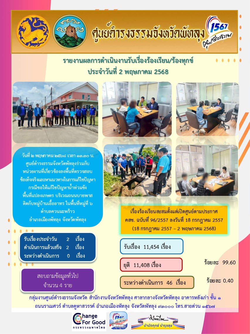 สถิติรับเรื่องร้องเรียน/ร้องทุกข์ วันที่ 2 พฤษภาคม 2568