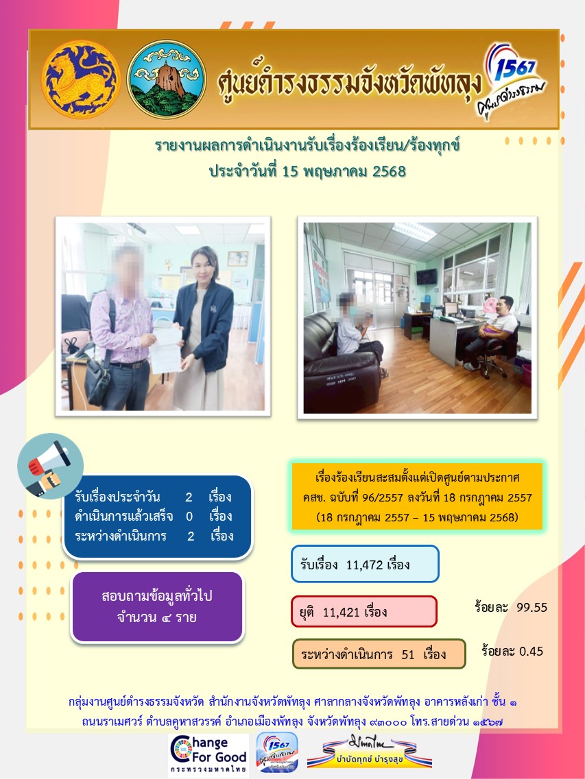 สถิติรับเรื่องร้องเรียน/ร้องทุกข์ วันที่ 15 พฤษภาคม 2568