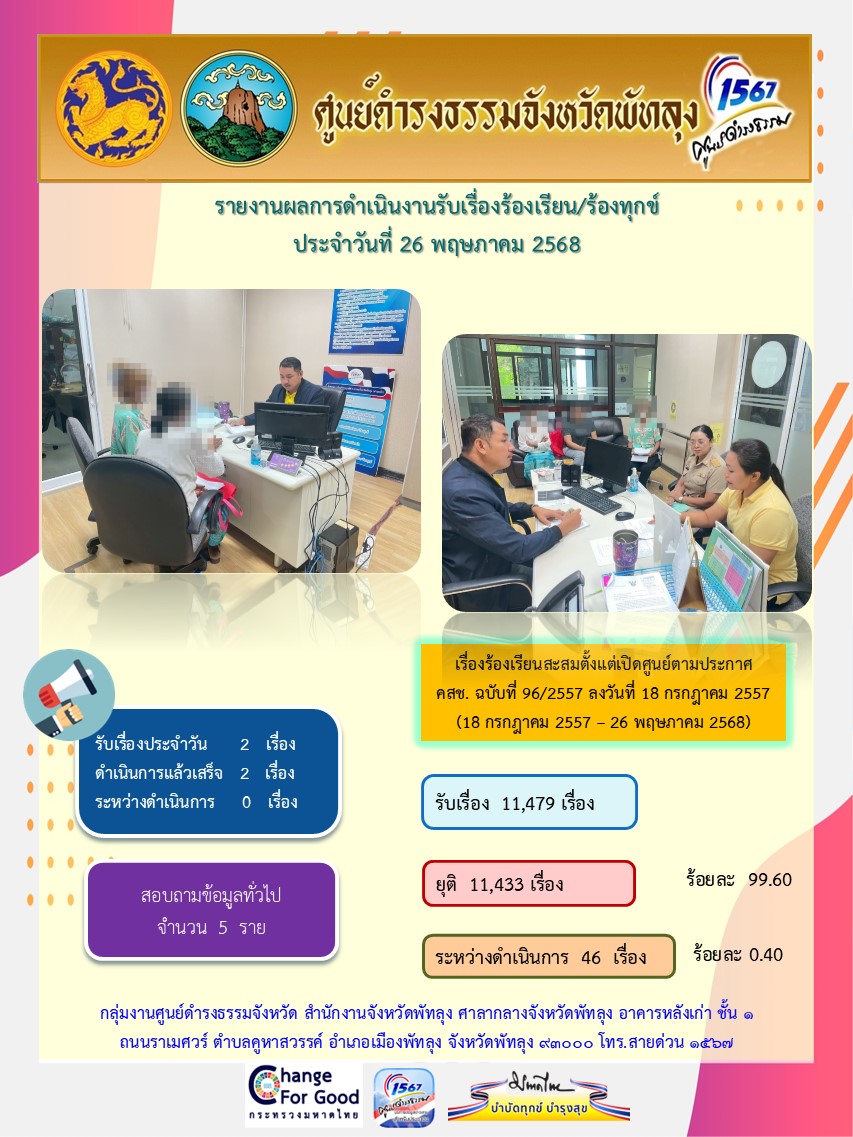 สถิติรับเรื่องร้องเรียน/ร้องทุกข์ วันที่ 26 พฤษภาคม 2568
