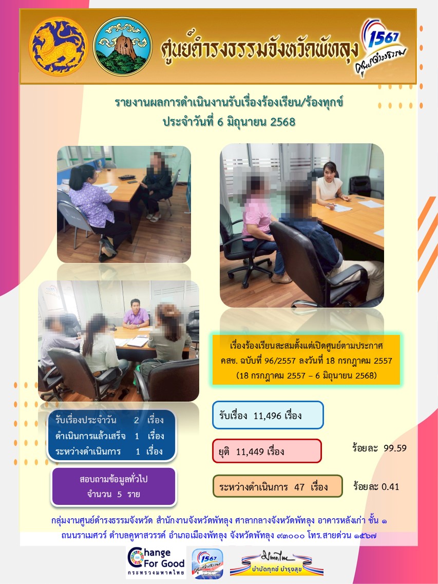 สถิติรับเรื่องร้องเรียน/ร้องทุกข์ วันที่ 6 มิถุนายน 2568