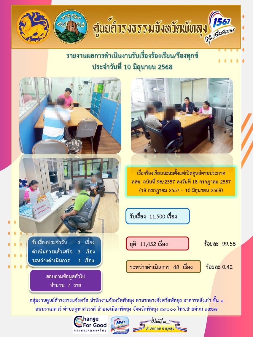 สถิติรับเรื่องร้องเรียน/ร้องทุกข์ วันที่ 10 มิถุนายน 2568