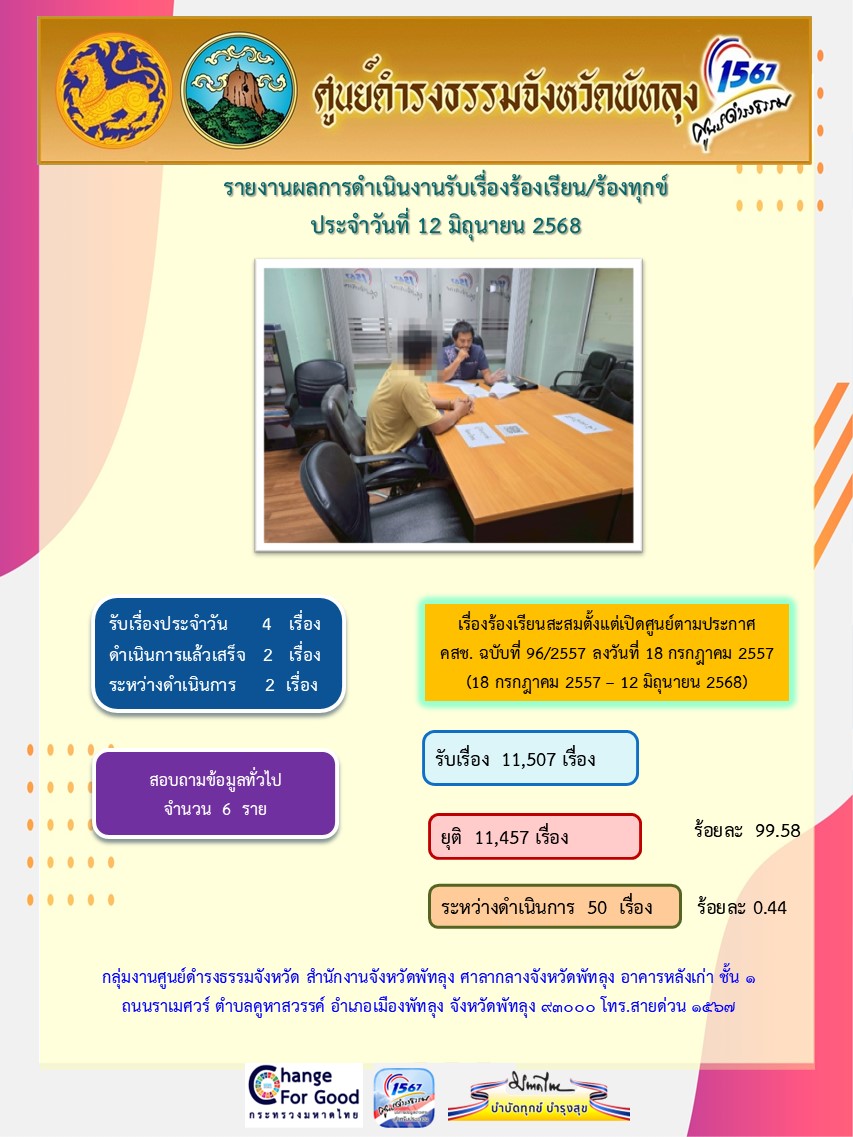 สถิติรับเรื่องร้องเรียน/ร้องทุกข์ วันที่ 12 มิถุนายน 2568