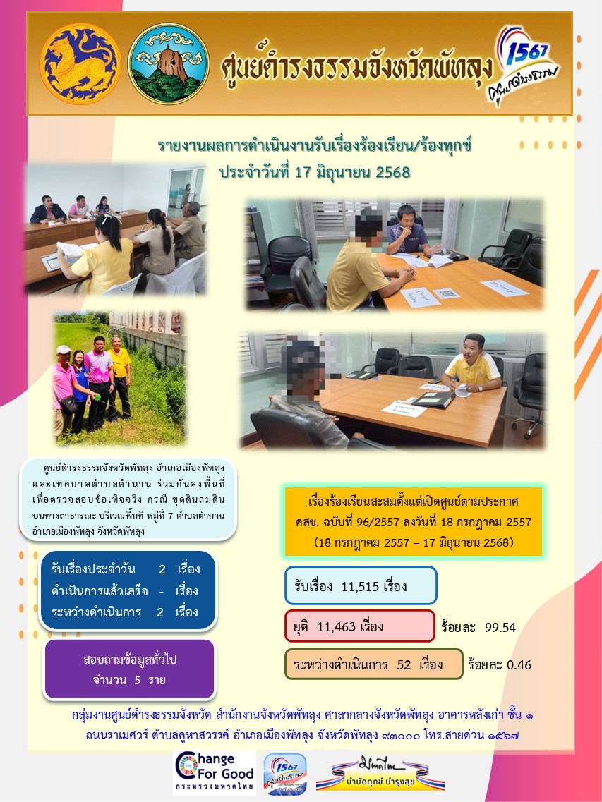 สถิติรับเรื่องร้องเรียน/ร้องทุกข์ วันที่ 17 มิถุนายน 2568