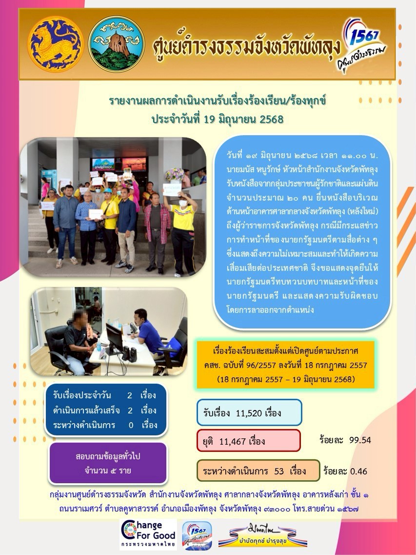 สถิติรับเรื่องร้องเรียน/ร้องทุกข์ วันที่ 19 มิถุนายน 2568