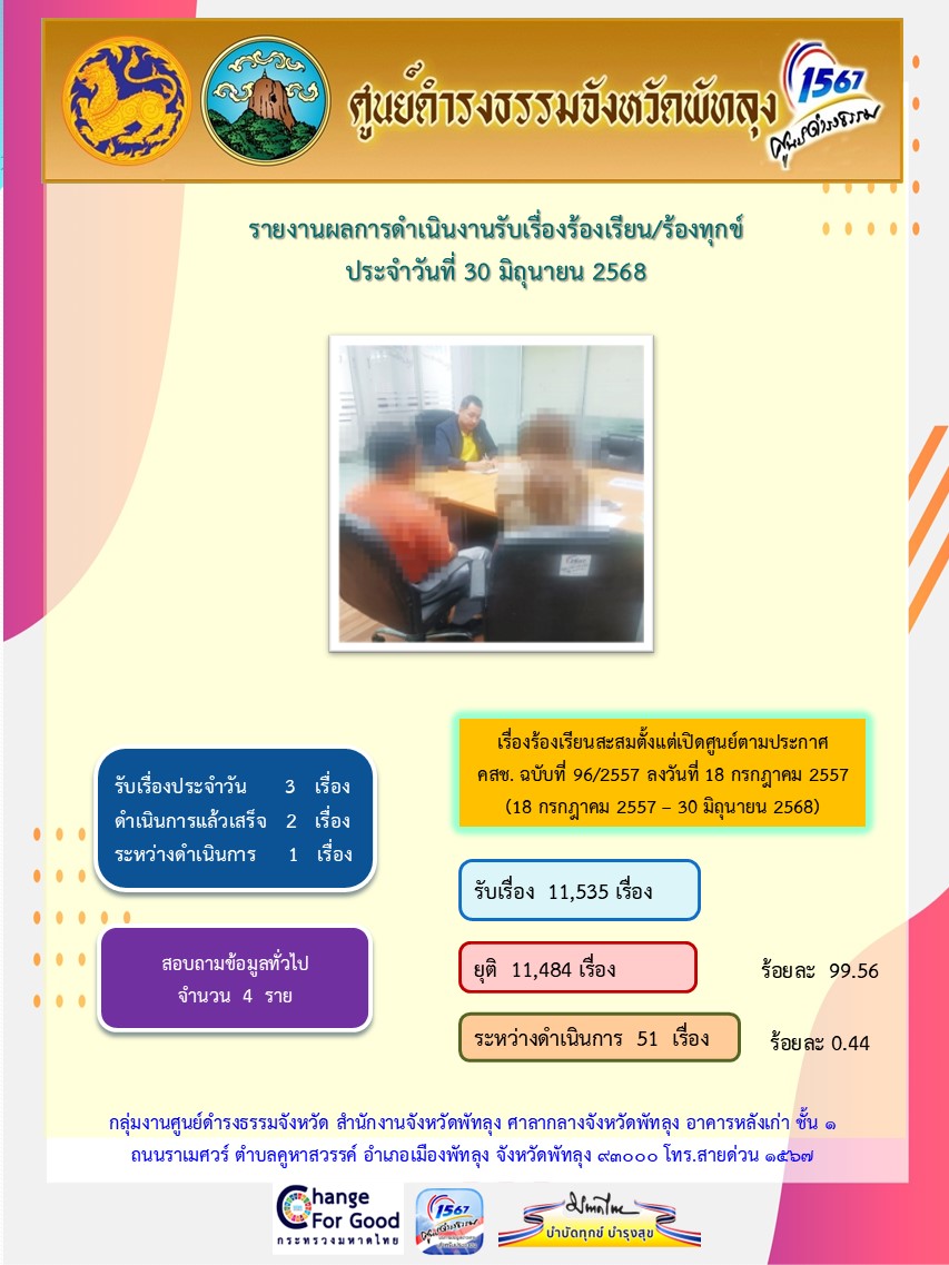 สถิติรับเรื่องร้องเรียน/ร้องทุกข์ วันที่ 30 มิถุนายน 2568