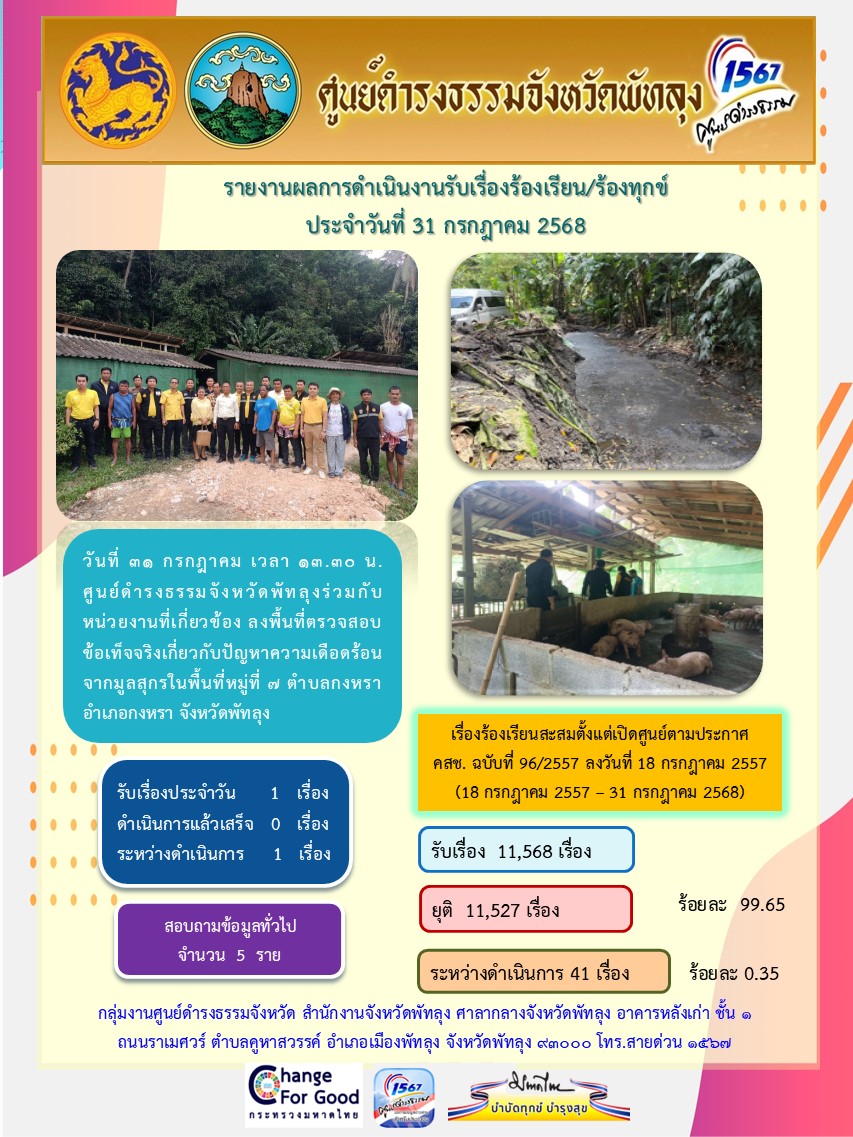 สถิติรับเรื่องร้องเรียน/ร้องทุกข์ วันที่ 31 กรกฎาคม 2568