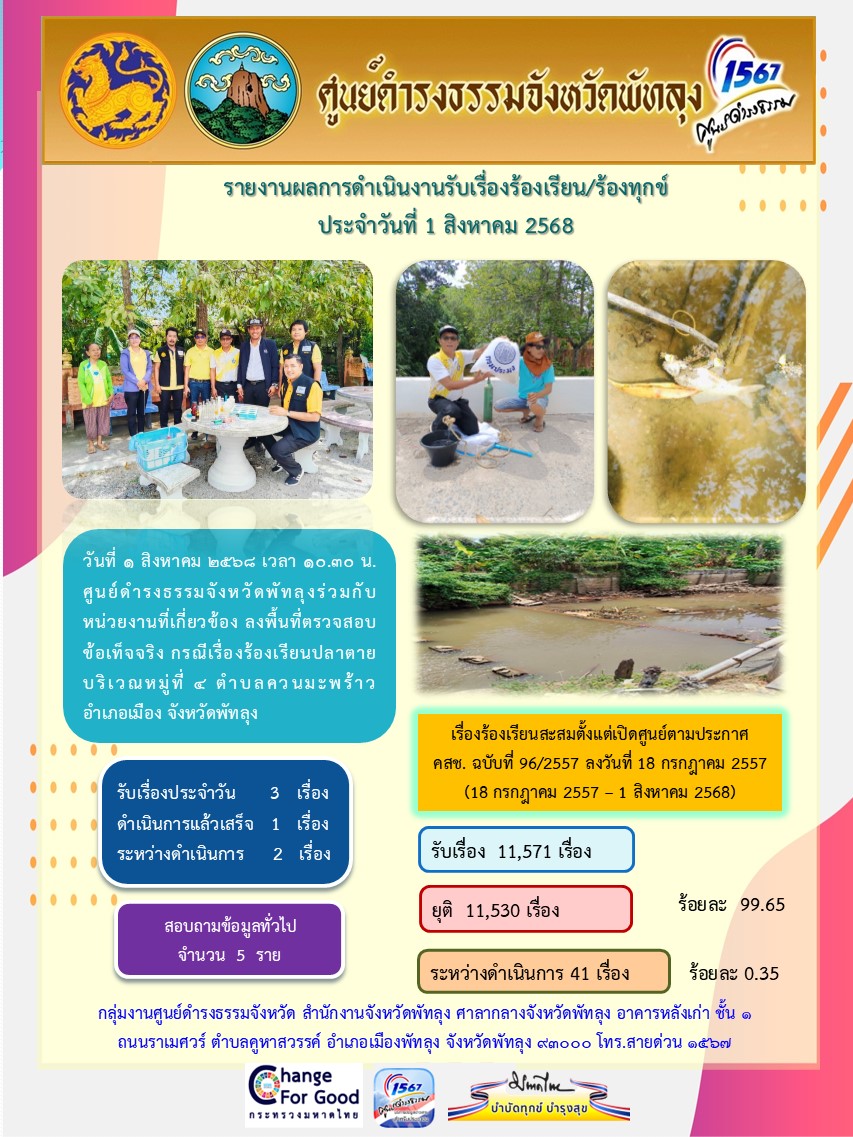 สถิติรับเรื่องร้องเรียน/ร้องทุกข์ วันที่ 1 สิงหาคม 2568