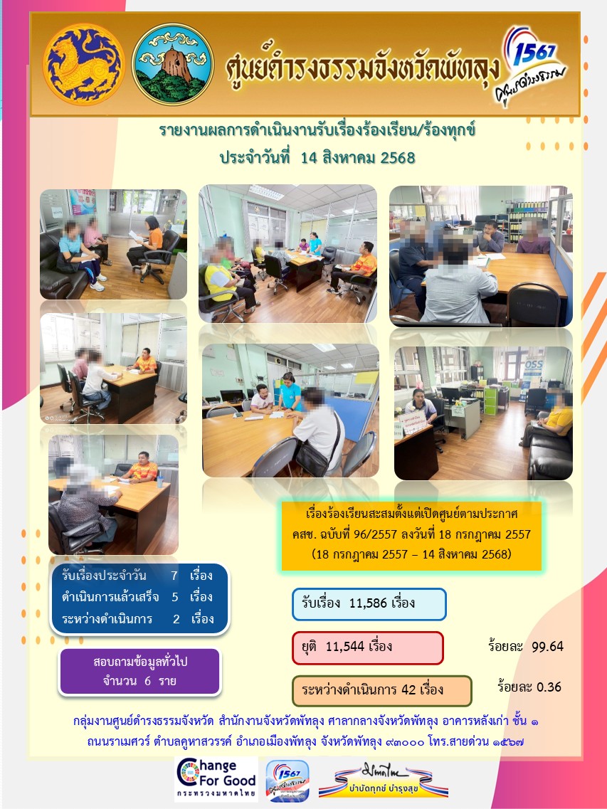 สถิติรับเรื่องร้องเรียน/ร้องทุกข์ วันที่ 14 สิงหาคม 2568