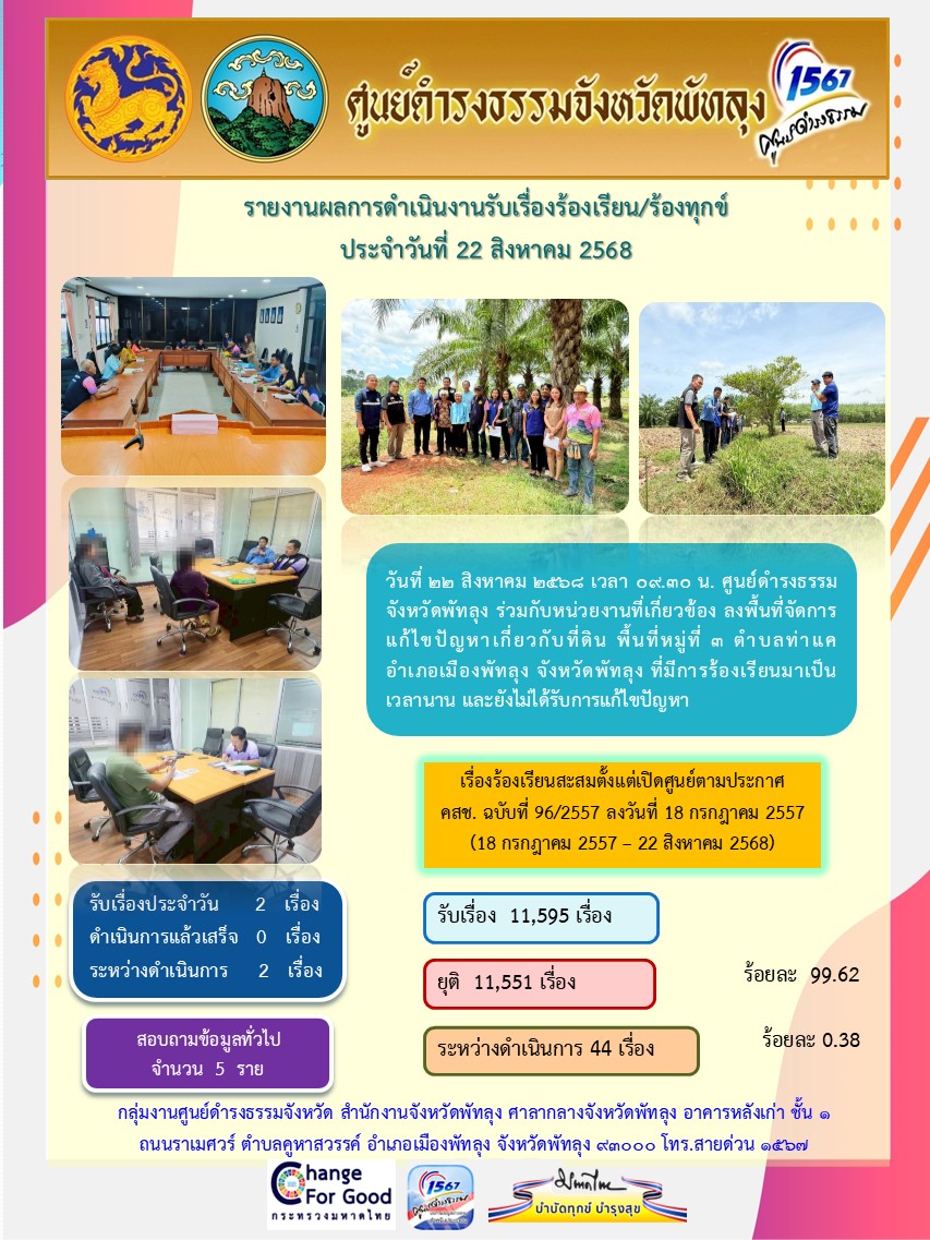 สถิติรับเรื่องร้องเรียน/ร้องทุกข์ วันที่ 22 สิงหาคม 2568