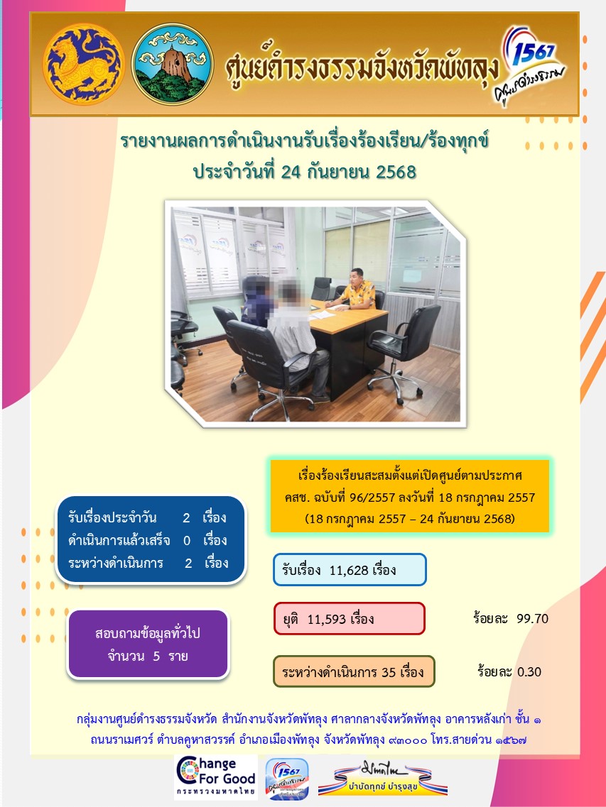 สถิติรับเรื่องร้องเรียน/ร้องทุกข์ วันที่ 24 กันยายน 2568