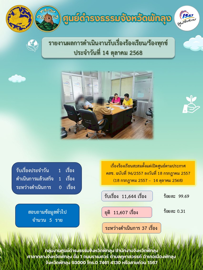 สถิติรับเรื่องร้องเรียน/ร้องทุกข์ วันที่ 14 ตุลาคม 2568