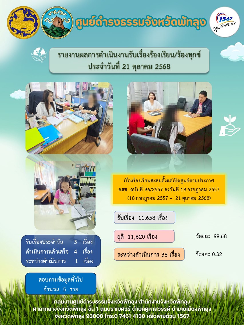 สถิติรับเรื่องร้องเรียน/ร้องทุกข์ วันที่ 21 ตุลาคม 2568