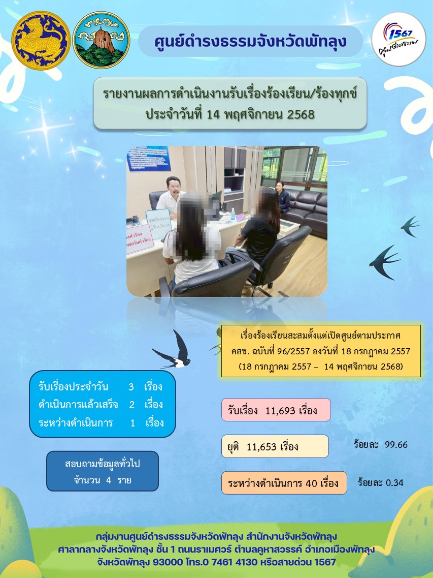 สถิติรับเรื่องร้องเรียน/ร้องทุกข์ วันที่ 14 พฤศจิกายน 2568