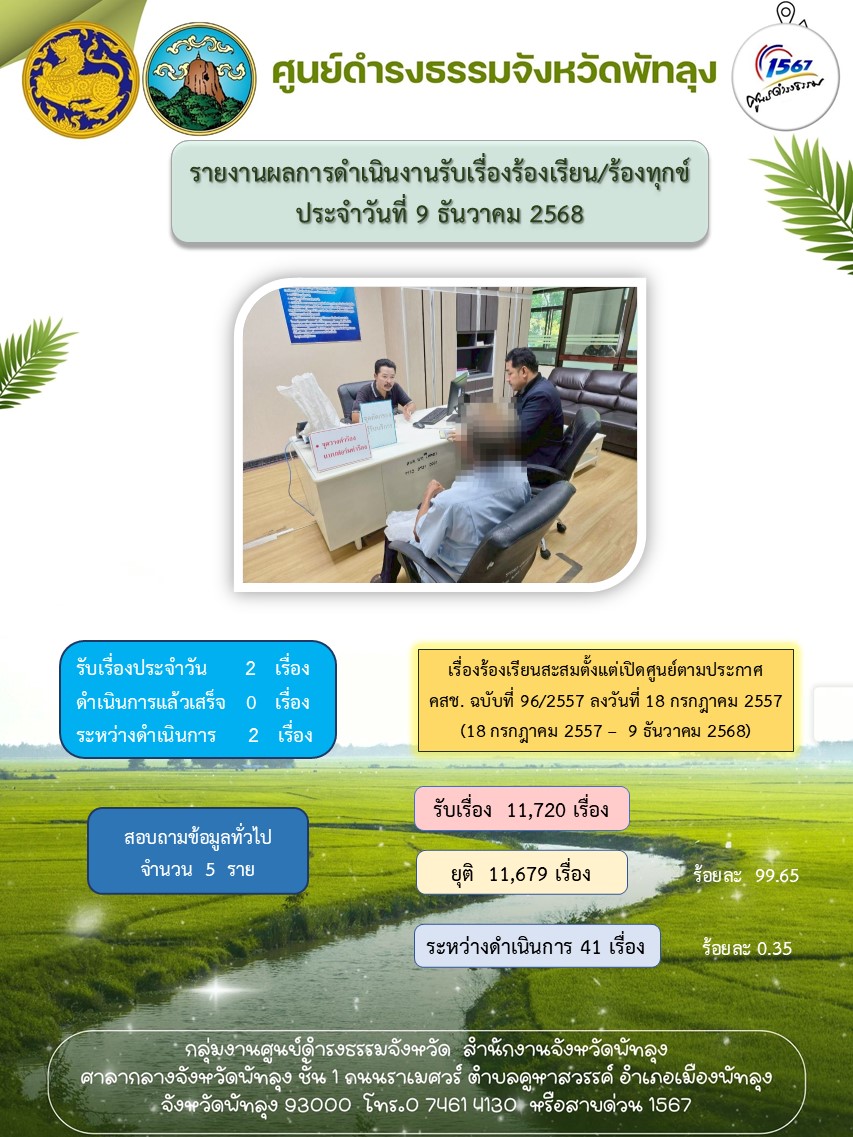 สถิติรับเรื่องร้องเรียน/ร้องทุกข์ วันที่ 9 ธันวาคม 2568