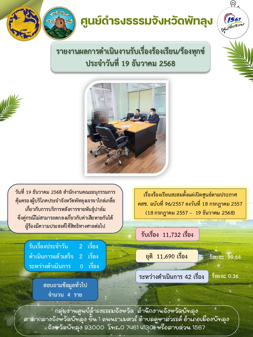 สถิติรับเรื่องร้องเรียน/ร้องทุกข์ วันที่ 19 ธันวาคม 2568