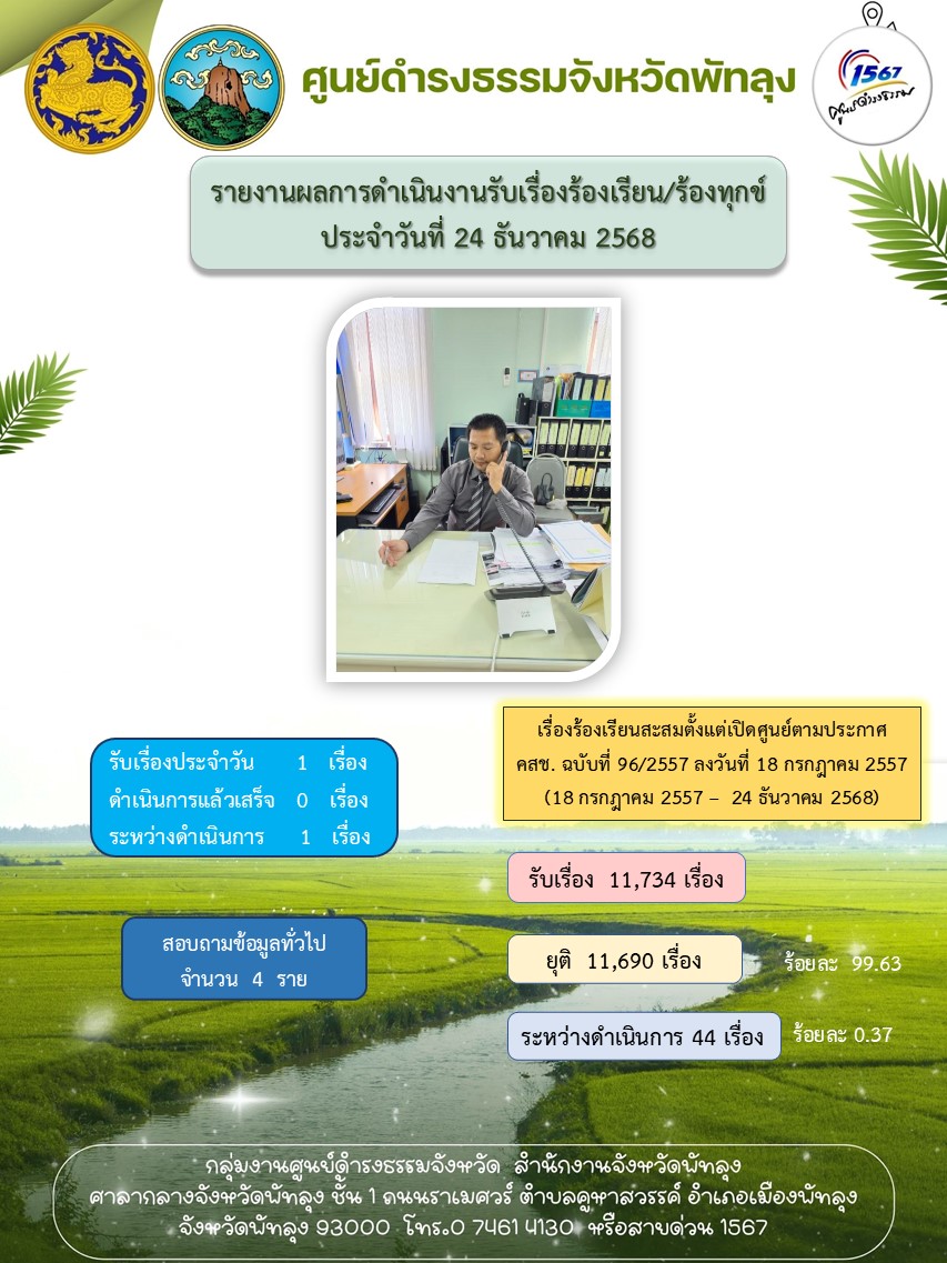 สถิติรับเรื่องร้องเรียน/ร้องทุกข์ วันที่ 24 ธันวาคม 2568