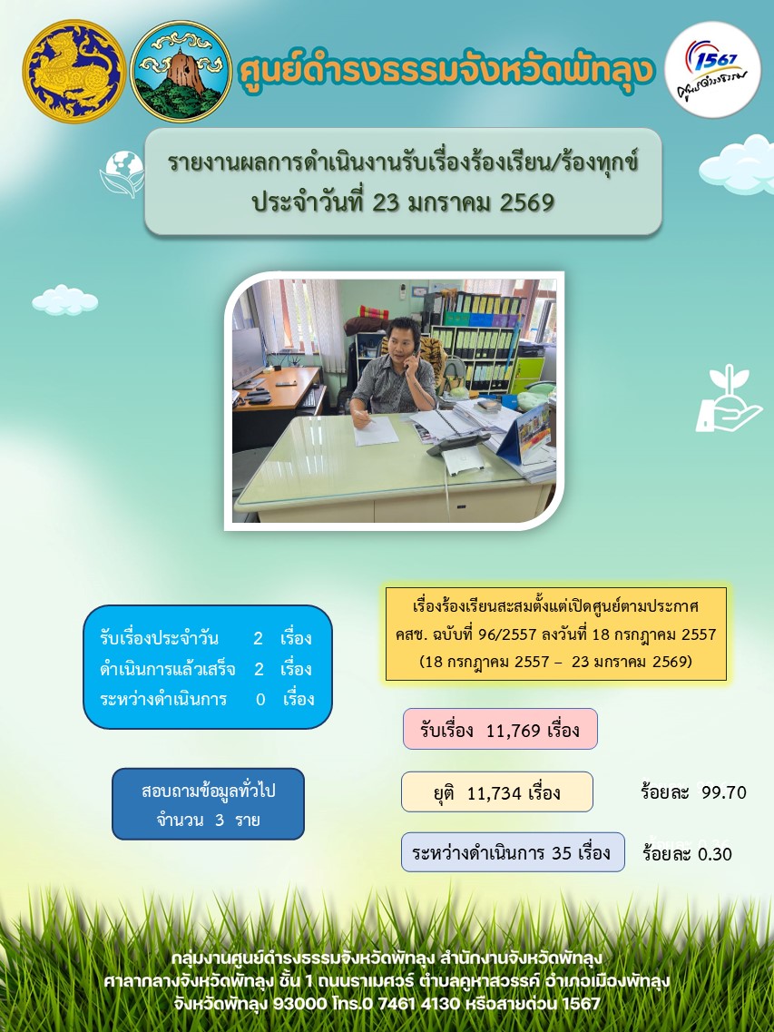 สถิติรับเรื่องร้องเรียน/ร้องทุกข์ วันที่ 23 มกราคม 2569