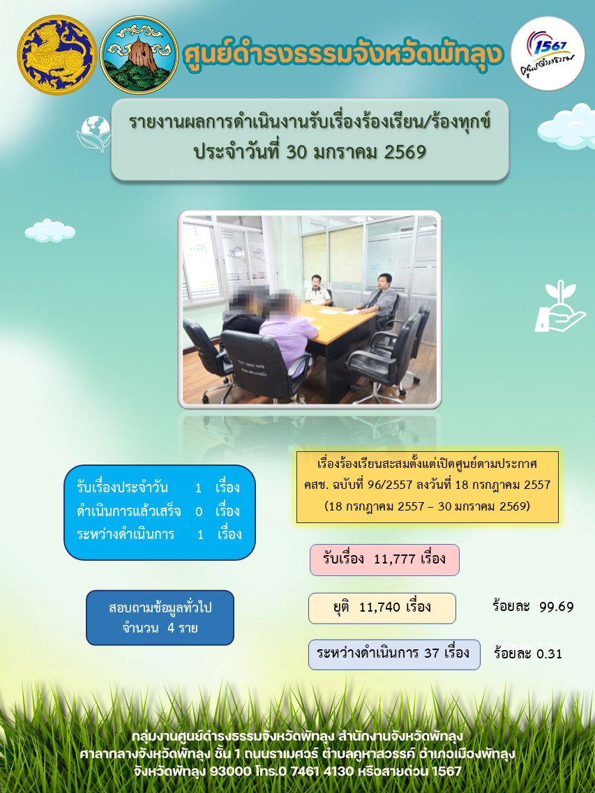 สถิติรับเรื่องร้องเรียน/ร้องทุกข์ วันที่ 30 มกราคม 2569