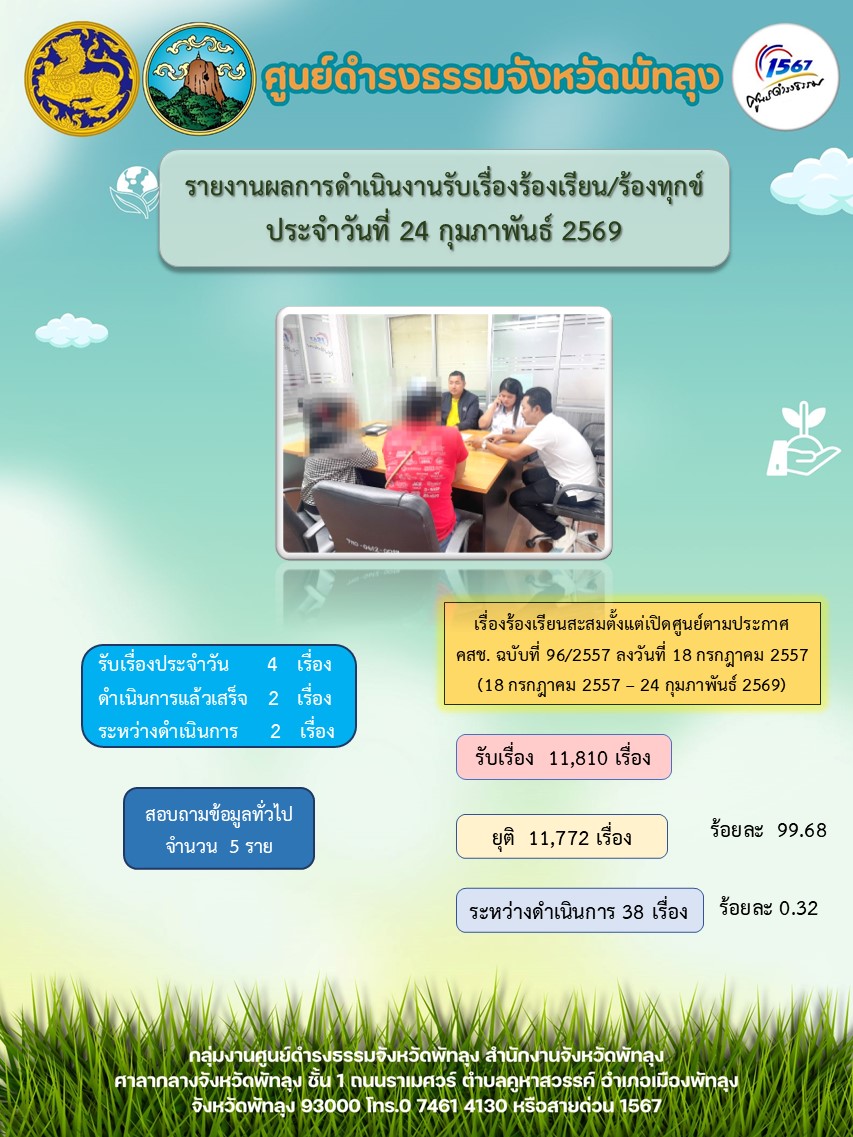 สถิติรับเรื่องร้องเรียน/ร้องทุกข์ วันที่ 24 กุมภาพันธ์ 2569