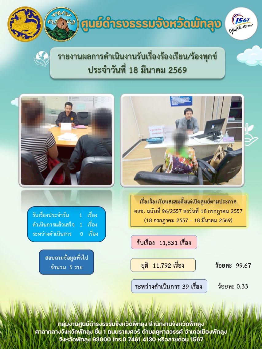 สถิติรับเรื่องร้องเรียน/ร้องทุกข์ วันที่ 18 มีนาคม 2569
