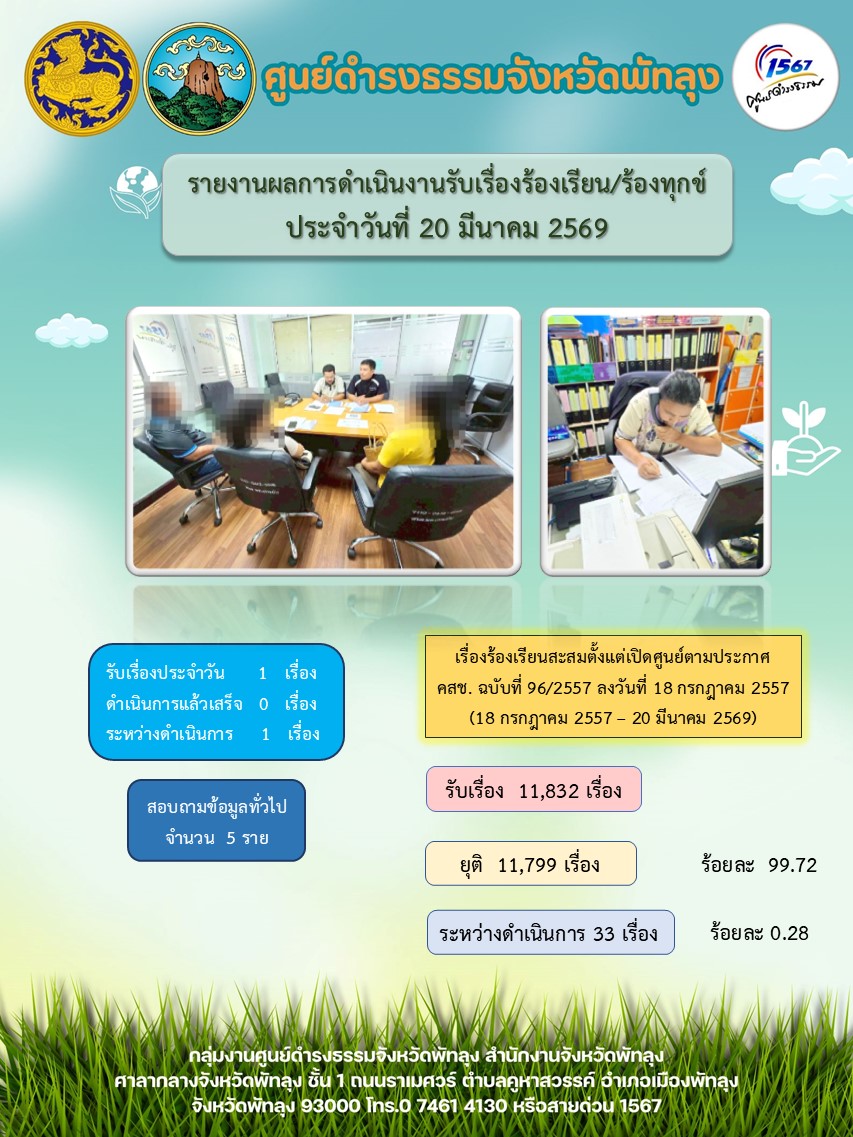 สถิติรับเรื่องร้องเรียน/ร้องทุกข์ วันที่ 20 มีนาคม 2569