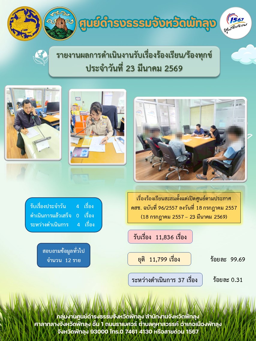 สถิติรับเรื่องร้องเรียน/ร้องทุกข์ วันที่ 23 มีนาคม 2569