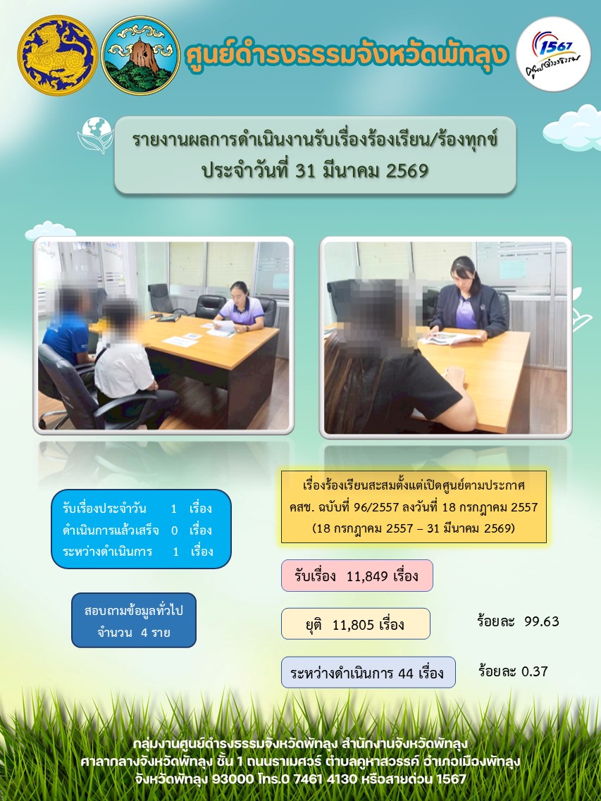 สถิติรับเรื่องร้องเรียน/ร้องทุกข์ วันที่ 31 มีนาคม 2569